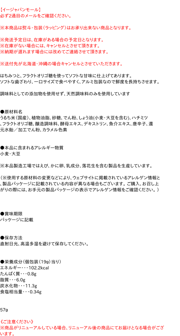 調味料としての添加物を使用せず、天然調味料のみを使用しています ●原材料名 うるち米(国産)、植物油脂、砂糖、でん粉、しょう油(小麦・大豆を含む)、ハチミツ、フラクトオリゴ糖、醸造調味料、酵母エキス、デキストリン、魚介エキス、唐辛子、還元水飴/加工でん粉、カラメル色素 ●本品に含まれるアレルギー物質 小麦・大豆 ※本品製造工場ではえび、かに卵、乳成分、落花生を含む製品を生産しています。