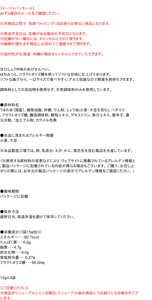 ●栄養成分(1袋15g当り) エネルギー・・・80.7kcal たんぱく質・・・0.6g 脂質・・・4.7g 炭水化物・・・9.0g 食塩相当量・・・0.27g フラクトオリゴ糖・・・60.0mg 15g×4袋【メーカー・製造または販売元】株式会社 栗山米菓0120-957-893【広告文責】株式会社イージャパンアンドカンパニーズ 072-875-6666《ご注意ください》 ※商品がリニューアルしている場合、リニューアル後の商品にてお届けとなる場合がございます。